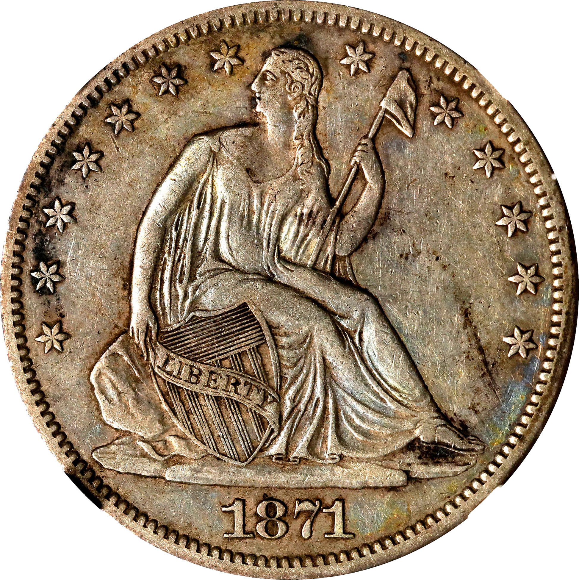 The 1871 Carson City Mint silver dollar is a rare coin in any grade, with an estimated 100 survivors overall. This is no surprise, given its very small mintage. Clearly, the large (by comparison) production of 1870 greatly reduced the need for additional dollars this year. There was never a substantial need for these coins, judging by the small mintages of the two following years, but circulate they did. Most survivors are well worn and/or damaged, and readers are urged to study the population of Details graded pieces by clicking on the block letter D for this issue in the NGC Census. The few Mint State coins known are all prooflike to some degree, as the dies didn't wear enough to lose their initial polish. Some weakness of strike is seen on nearly all examples, this being most evident in the shallowness of the word LIBERTY. This feature is directly opposite the upper part of the eagle's right wing, which is another area of weakness. This technical deficiency is seen in many coins of the type from all three mints, but Carson City seems to have had the most difficulty in bringing up LIBERTY across several denominations. Just a single pair of dies was employed for this issue, the reverse die being one that had been used previously to coin 1870-CC dollars. The obverse exhibits a misplace numeral 1 within the denticles below the 7 of the date, but as all 1871-CC silver dollars are from this single die there is no variety interest.