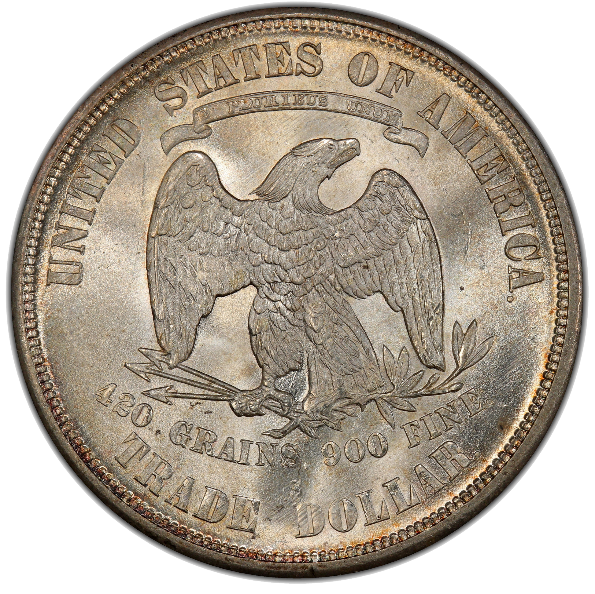 - Reverse: An American Bald Eagle facing right. A floating banner above the eagle states “E PLURIBUS UNUM” while above the banner are the words “UNITED STATES OF AMERICA.” The eagle holds three arrows in her right talon and an olive branch in her left. Below the eagle is the weight (420 grains) and the fineness (.900 Silver). Below is the denomination “TRADE DOLLAR” at the bottom of this reeded edge coin.