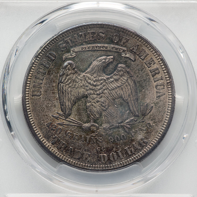 - Reverse: An American Bald Eagle facing right. A floating banner above the eagle states “E PLURIBUS UNUM” while above the banner are the words “UNITED STATES OF AMERICA.” The eagle holds three arrows in her right talon and an olive branch in her left. Below the eagle is the weight (420 grains) and the fineness (.900 Silver). Below is the denomination “TRADE DOLLAR” at the bottom of this reeded edge coin.