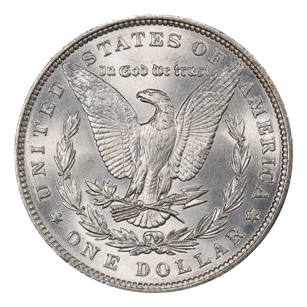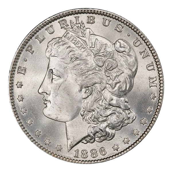 The obverse (heads side) of the 1886 Silver Dollar features a profile that represents Lady Liberty. The model for the portrait was Anna Weiss Williams, and she wears a Phrygian cap over her deeply detailed hair. The hat was known as a Liberty Cap, representing freedom during the Revolutionary War. It has a banner that reads Liberty, with leaves and flowers.