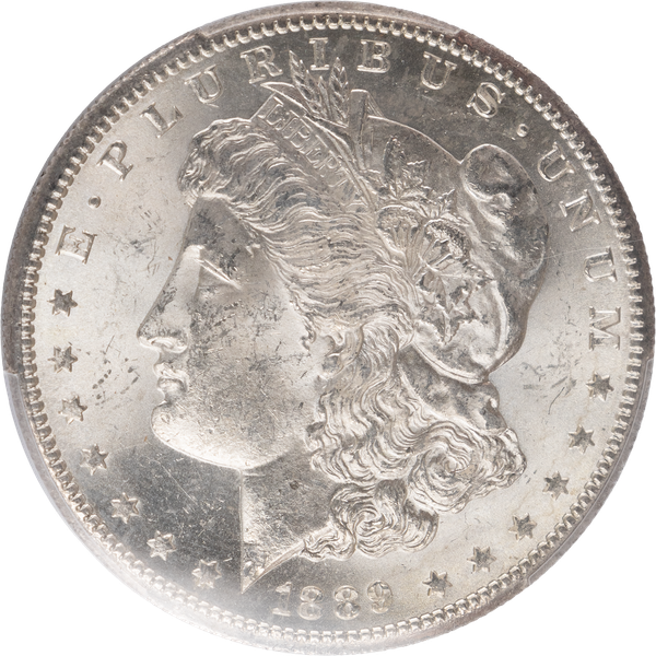 This large 90% silver Morgan dollar bears George T. Morgan's classic depiction of Liberty facing left in a Phrygian cap and a spray of leaves held by a ribbon inscribed LIBERTY. The reverse features an eagle clutching a branch and three arrows.