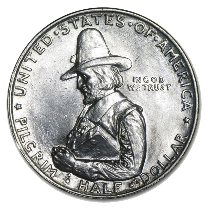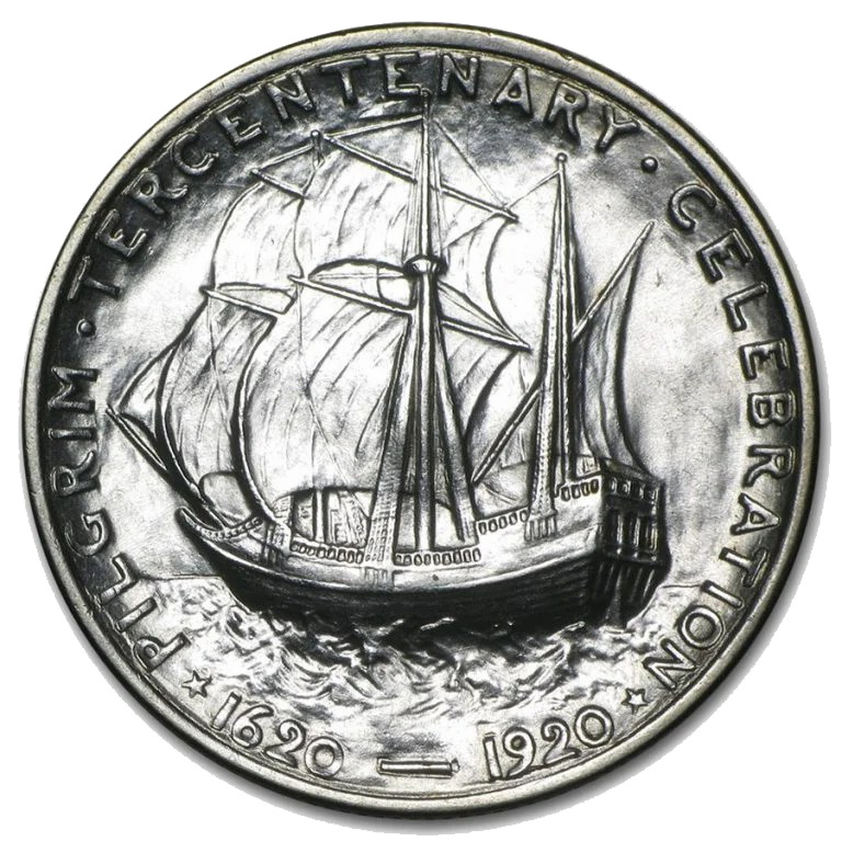 - HONORING THE PILGRIMS – This coin pays tribute to the 300th anniversary of the Pilgrims arriving at Plymouth Rock. It shows Governor William Bradford on the obverse and the Mayflower on the reverse.