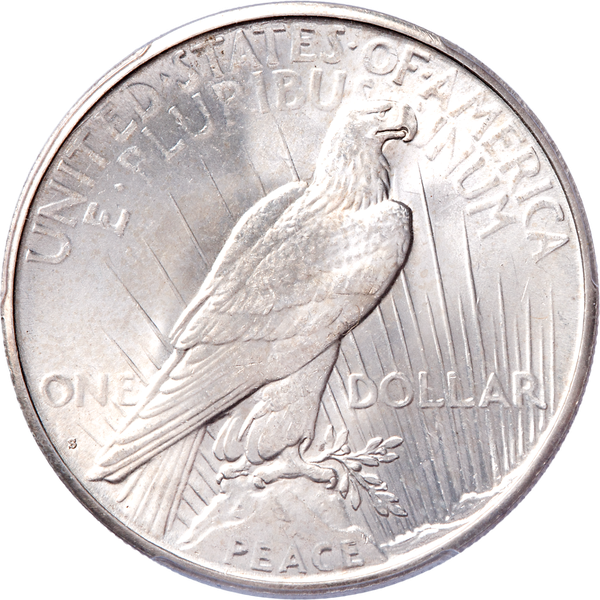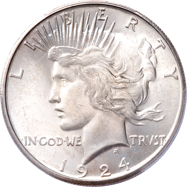 Issued from 1921-1935, the Peace dollar is the only U.S. silver dollar struck to commemorate peace. Struck by the prestigious San Francisco Mint, this classic 90%-silver coin features Liberty wearing a tiara of light. She is framed by the mottoes and . (The word "trust" is spelled in classic style, with V in place of U.) The reverse bears the inscription PEACE, along with an eagle holding an olive branch, perched on a rock above a rising unseen sun. In the year 1924, Julius Guttag organized the first National Coin Week. That same year, the first Macy's Thanksgiving Day Parade was held in New York City. Recall these historic firsts with a 1924-S Peace silver dollar!