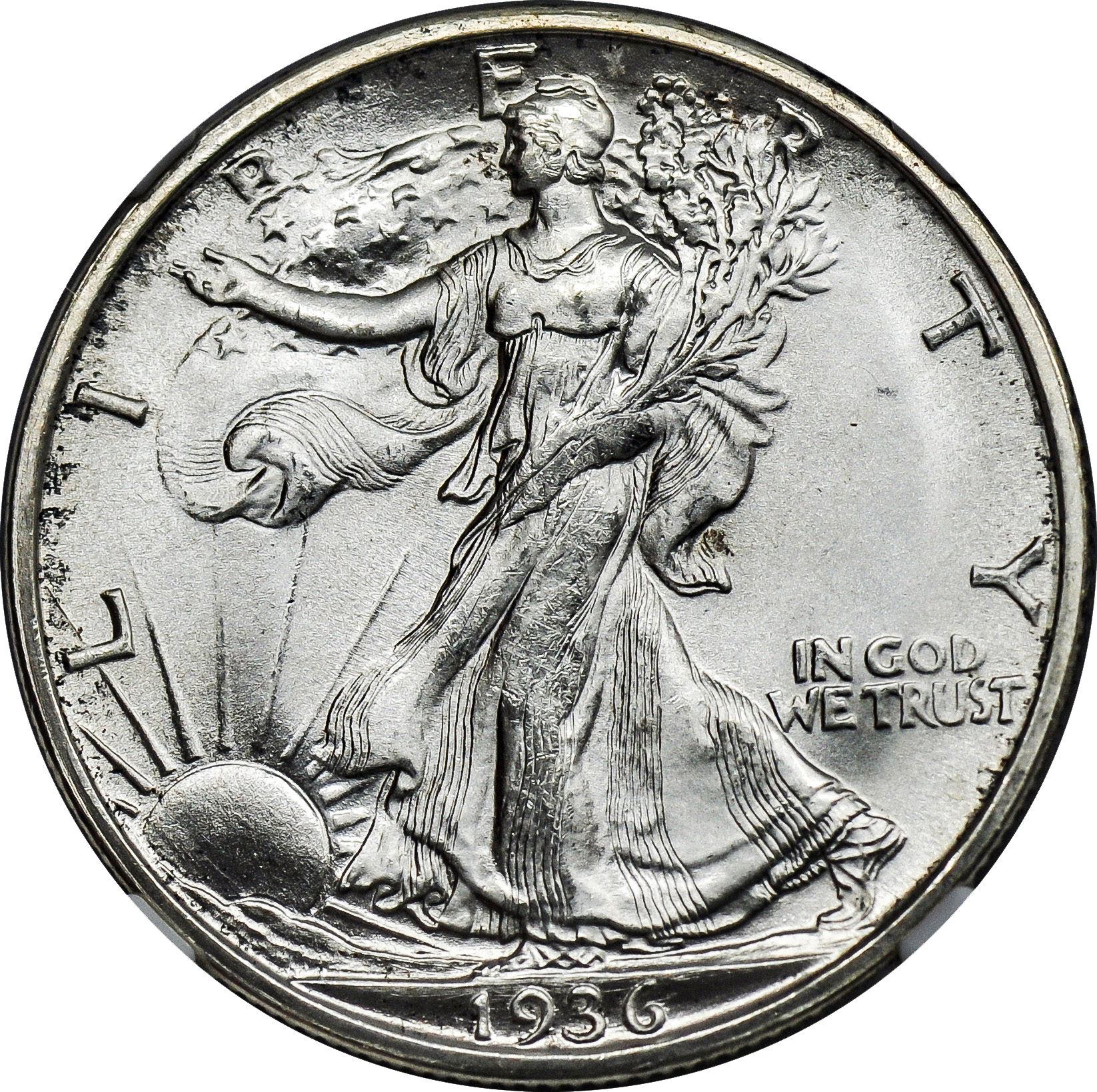 - Obverse: Walking Liberty holding branches with the sun rising