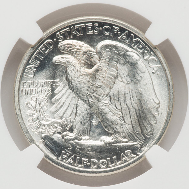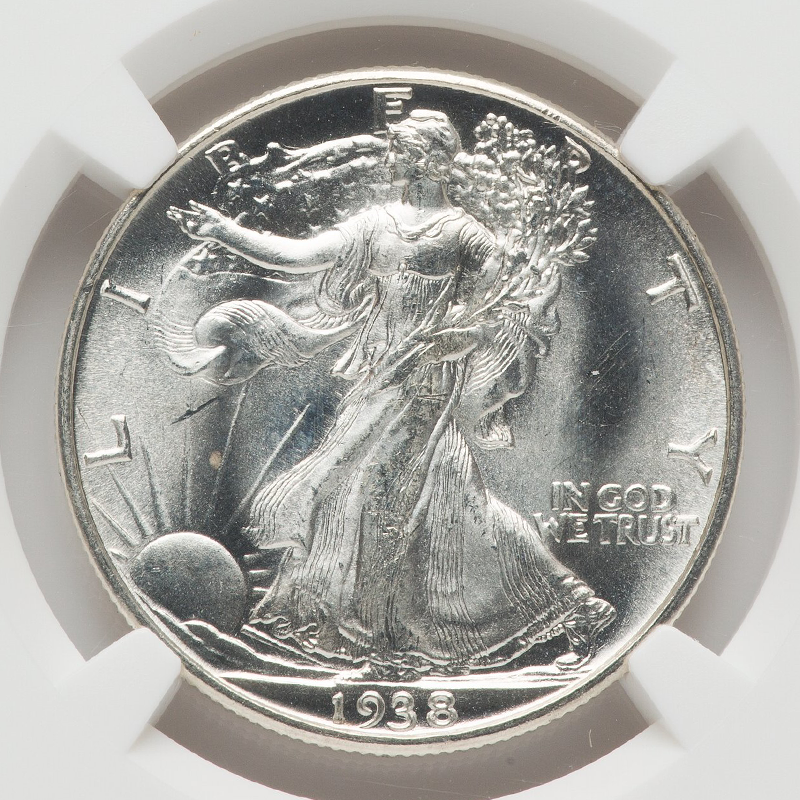 The 1938-D Liberty Walking half dollars were struck in precious 90% silver at the Denver Mint. Bearing A. A. Weinman's artistically pleasing and highly acclaimed design, these coins depict a full-length figure of Liberty striding toward the rising sun of a new day. The reverse features a superbly detailed eagle perched upon a mountain crag. A pine sapling represents the spirit of America. Add the 1938-D Liberty "Walker" to your collection today.