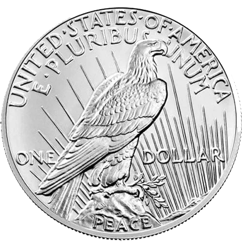 - The reverse depicts an eagle at rest holding an olive branch above the inscription “PEACE.” Additional inscriptions are “UNITED STATES OF AMERICA,” “E PLURIBUS UNUM,” and “ONE DOLLAR.”