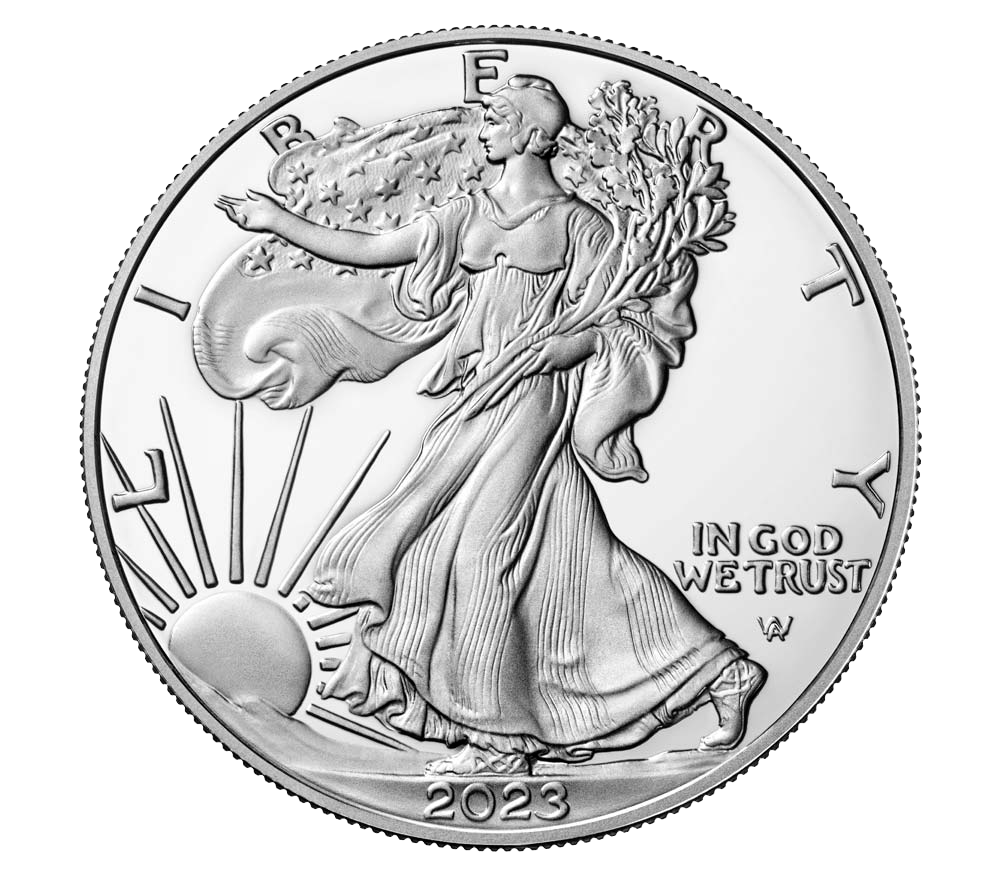 The classic Walking Liberty design by Adolph A. Weinman featured on the coin’s obverse (heads) has long been a collector favorite. It depicts Liberty in full stride, enveloped in folds of the flag, with her right hand extended and branches of laurel and oak in her left. Refreshed in 2021, the design now incorporates some of Weinman’s original details that were not previously possible. Inscriptions are “LIBERTY,” “2023,” and “IN GOD WE TRUST.”
