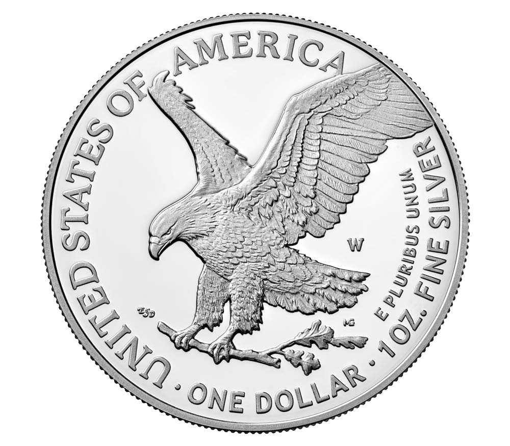 A completely new reverse (tails) design was introduced in 2021. It features an eagle as it approaches a landing, carrying an oak branch, as if to add it to a nest. Inscriptions are “UNITED STATES OF AMERICA,” “E PLURIBUS UNUM,” “1 OZ. FINE SILVER,” and “ONE DOLLAR.”